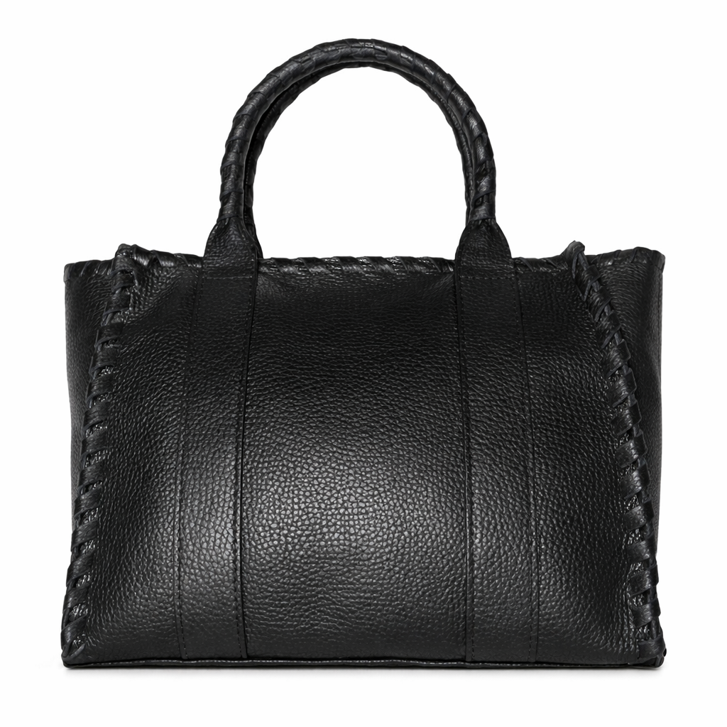 Zwarte Tas, type Tote Bag is een stijlvolle lederen handtas met afneembaar en verstelbaar hengsel, waardoor de tas ook als crossbody gedragen kan worden. De tas heeft prachtige details, zowel de tas als de handvatten zijn voorzien van geregen lederen veters, waardoor deze tas een luxe uitstraling heeft.