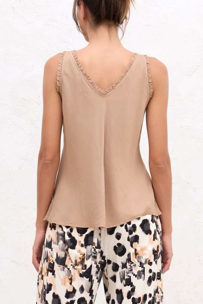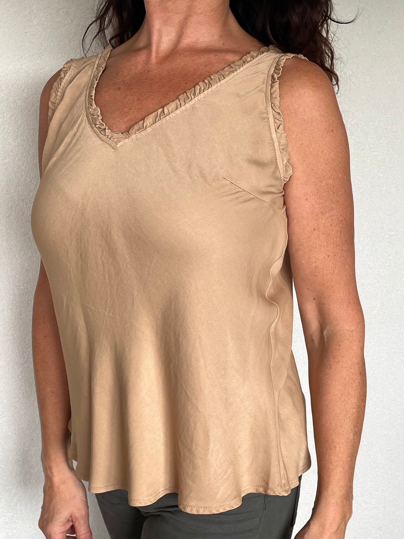 Ideale top met V-hals en ruches, een klokkend model in mooie gladde en subtiel glanzende stof.