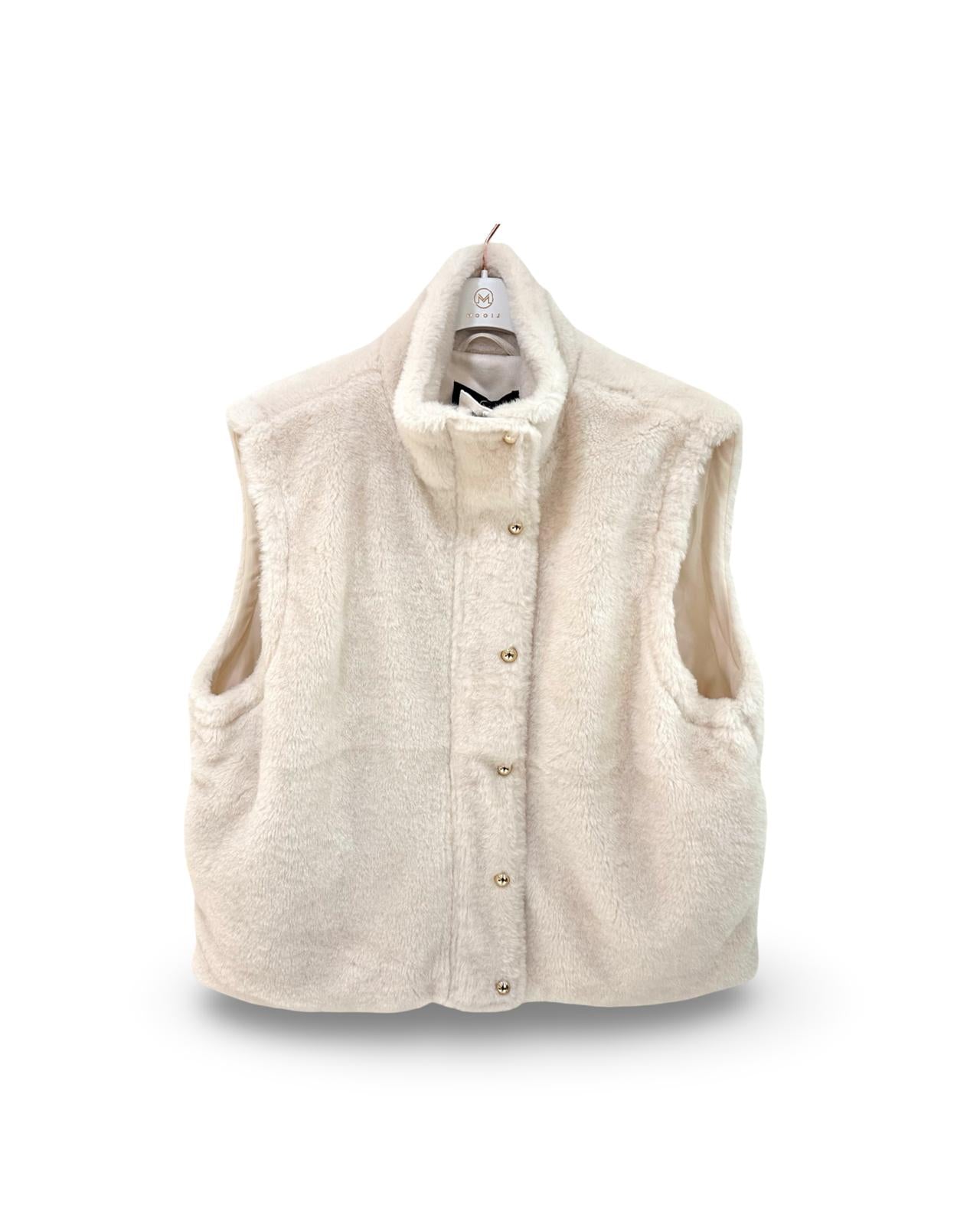 Warme en zachte faux fur bodywarmer van Mooij met opstaande kraag, ritssluiting, steekzakken en goudkleurige drukknopen. Bodywarmer Deluxe Nola is volledig gevoerd en afgewerkt met suèdine, wat deze bodywarmer een luxe uitstraling geeft.