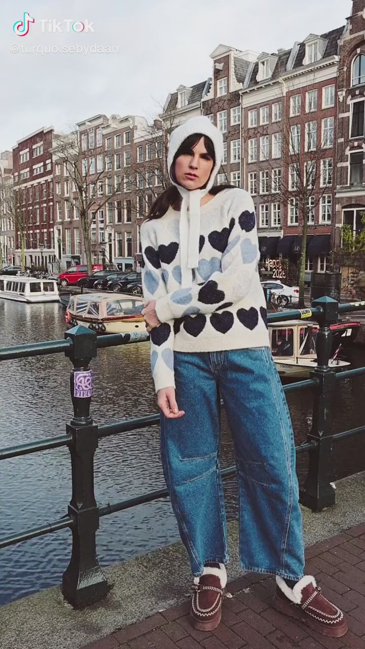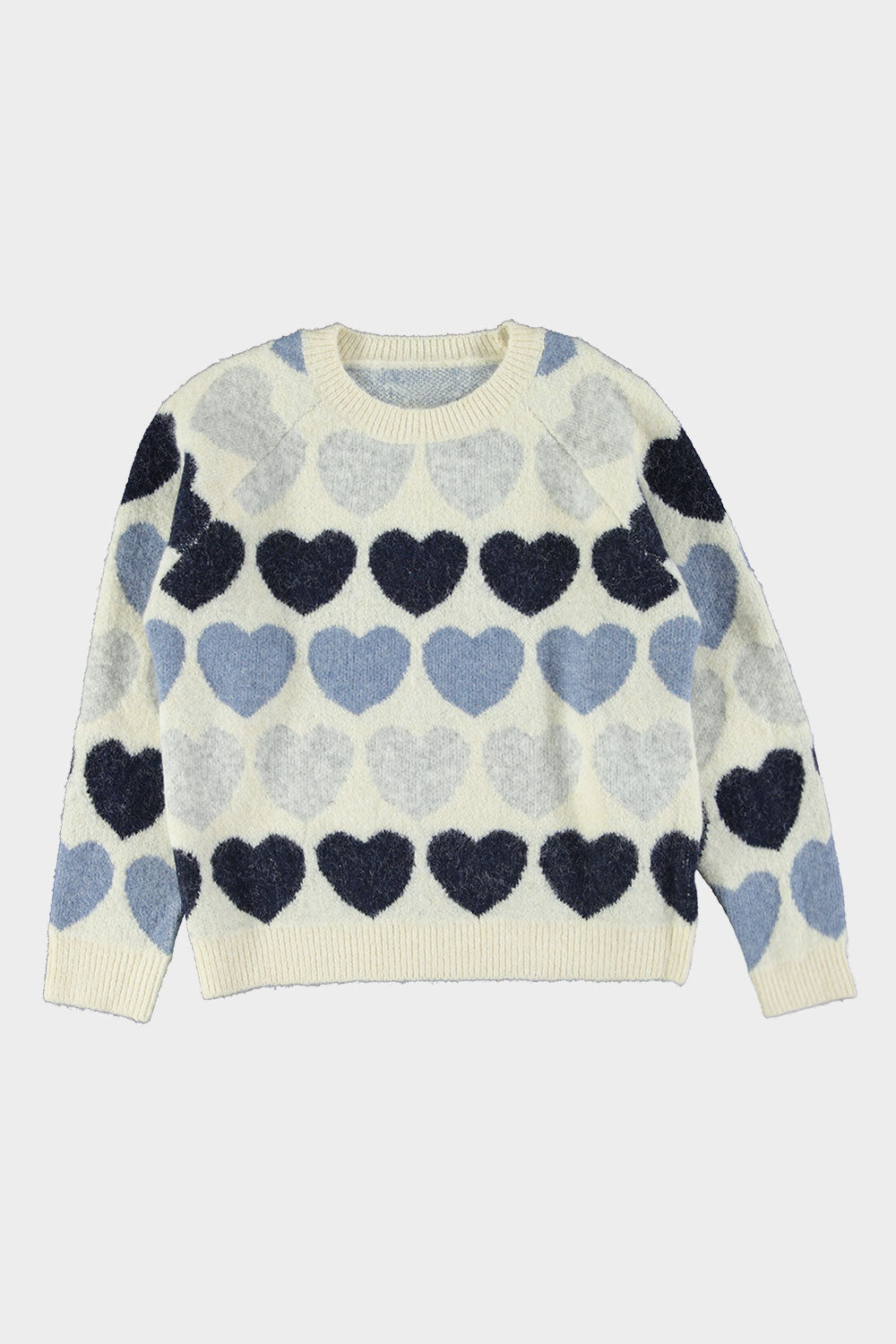 Deze zachte, gebreide trui straalt warmte en speelsheid uit dankzij het patroon van hartjes in verschillende tinten blauw en ecru. De zorgvuldig gekozen kleuren – van diep marineblauw tot licht pastelblauw – vormen samen een harmonieus geheel dat subtiel contrasteert met het ecru. Het hartjesmotief loopt gelijkmatig over de trui, waardoor een charmante en unieke uitstraling ontstaat.